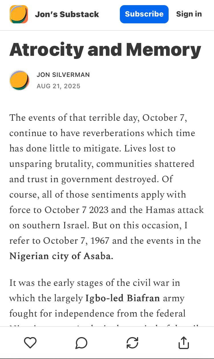 Pictures worth a thousand words. October 7: Two uncanny massacres mark this date in history. In 2023, the Hamas massacre of the people of the new Jewish state. In 1967, the genocide of the people of Asaba— some say, of the ancient biblical Hebrew.