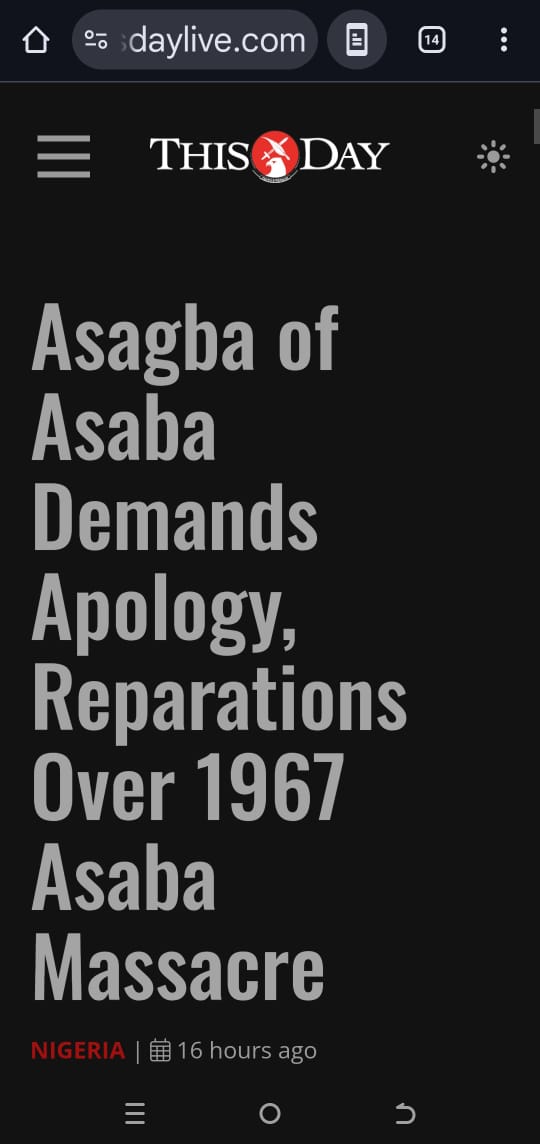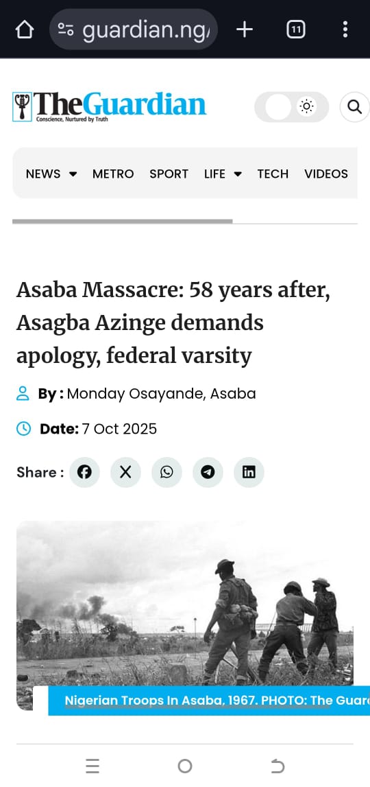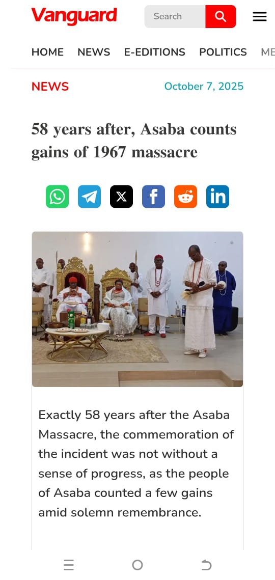 Fifty-eight years after the tragic Asaba massacre, the Asagba of Asaba, His Royal Majesty, Obi (Prof.) Epiphany Azinge (SAN), has renewed calls for national recognition of the victims, urging President Bola Ahmed Tinubu to immortalise them through an official presidential apology and the establishment of a Federal University in Asaba. (7th October 2025)